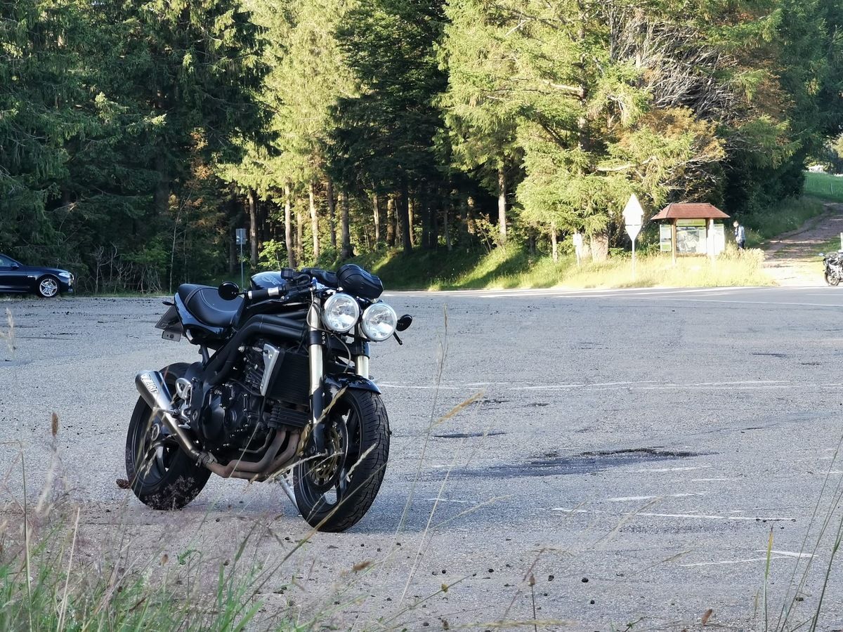 I found a low-ish cost 2007 Speed Triple in black relatively easily. I didn’t want a brand new bike, as I was learning. I didn’t want to drop it and put the first marks on it; I wanted something that had lived a bit. I had a test ride for an hour, and bought it immediately. I loved the all-black-with-gold-forks look.
